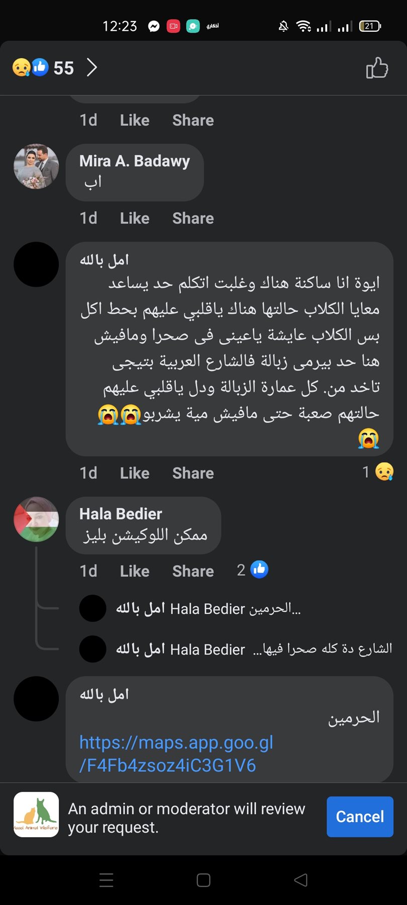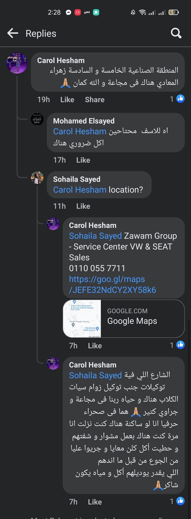 ونشر حساب بإسم كارول هشام تفاصيل أخرى لحالات مشابهة ولكن في منطقة أخرى، قائلة: «الكلاب هناك وحياة ربنا في مجاعة وجراوي كتير، هما في صحرا حرفيًا».