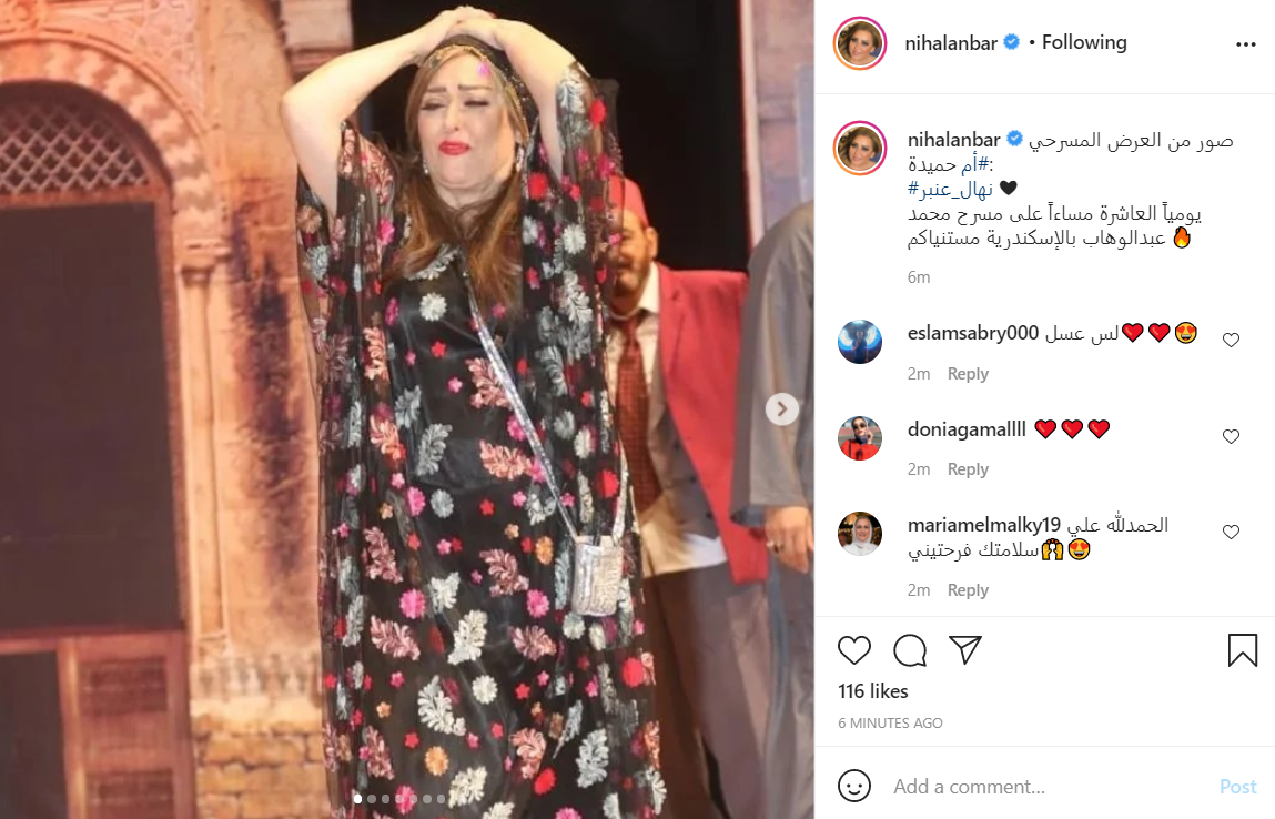 نشرت نهال عنبر، مجموعة من الصور التي تجمعها مع أبطال العمل، عبر حسابها الرسمي بموقع انستجرام، وكتبت عليها قائلة: صور من العرض المسرحي.. أم حميدة.. نهال عنبر.. يوميًا العاشرة مساءً على مسرح محمد عبد الوهاب بالإسكندرية مستنياكم.