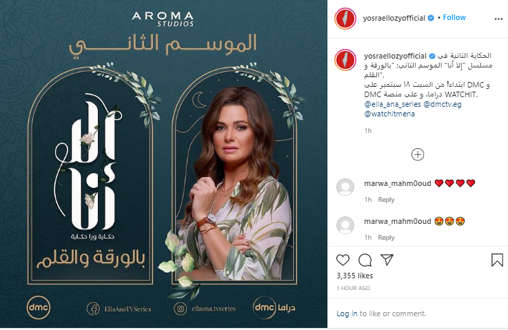 نشرت اللوزي صورة البوستر الدعائي للمسلسل، وذلك عبر حسابها الشخصي بموقع تبادل الصور والفيديوهات انستجرام، وعلقت: الحكاية التانية في مسلسل إلا أنا الموسم التاني بالورقة والقلم، ابتداءً من السبت 18 سبتمبر على DMC وDMC دراما، وعلى منصة WATCHIT.