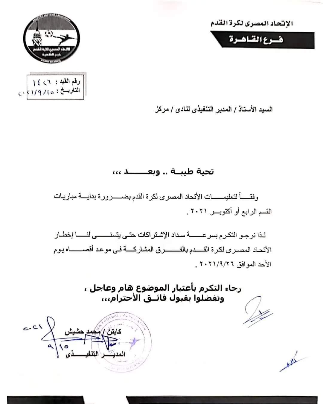 طالبت أفرع اتحاد كرة القدم بمختلف الجمهورية، فرق الدوري التي تنوي المشاركة في الموسم الجديد، بسرعة سداد الاشتراك الخاص بالمسابقة، بموعد أقصاه الأحد الموافق 26 سبتمبر الجاري.