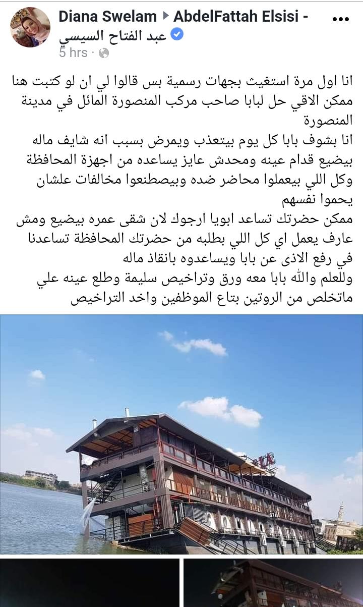 كتبت ديانا عبر حسابها الرسمي على إحدى مجموعات فيسبوك: أنا أول مرة أستغيث بجهات رسمية، بس قالولي إن لو كتبت هنا ممكن ألاقي حل لبابا صاحب مركب المنصورة المائلة في مدينة المنصورة.