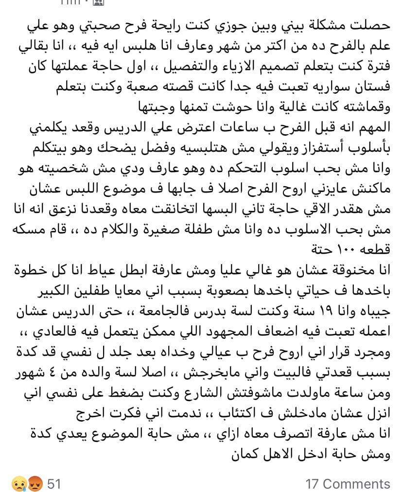 تداول رواد مواقع التواصل الاجتماعي فيس بوك، منشورًا لفتاة متزوجة منذ بلغت من العمر 19 عامًا، ولديها طفلان، وتلقى من زوجها سوء معاملة كما يمنعها من الخروج، ويأخذها خادمة له ولبيته، ويمنعها من أبسط حقوقها.
