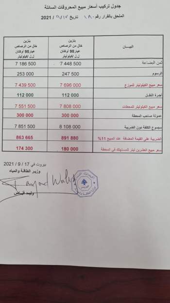 وزارة الطاقة والمياه اللبنانية أصدرت، خلال الساعات الماضية، جدول أسعار مبيع المحروقات السائلة، إذ ارتفعت أسعار البنزين عيار 95 أوكتان إلى 174 ألفًا و300 ليرة لبنانية.