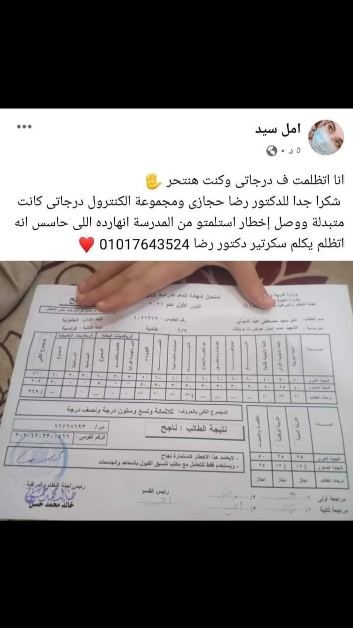 علق الدكتور رضا حجازي، نائب وزير التعليم لشئون المعلمين، على منشور تداوله عدد من مستخدمي مواقع التواصل الاجتماعي، لطالبة بالثانوية العامة، كتبت أنها تقدمت بتظلم في درجاتها وحاولت الانتحار، متوجهة بالشكر لنائب وزير التعليم على استعادة درجاتها.