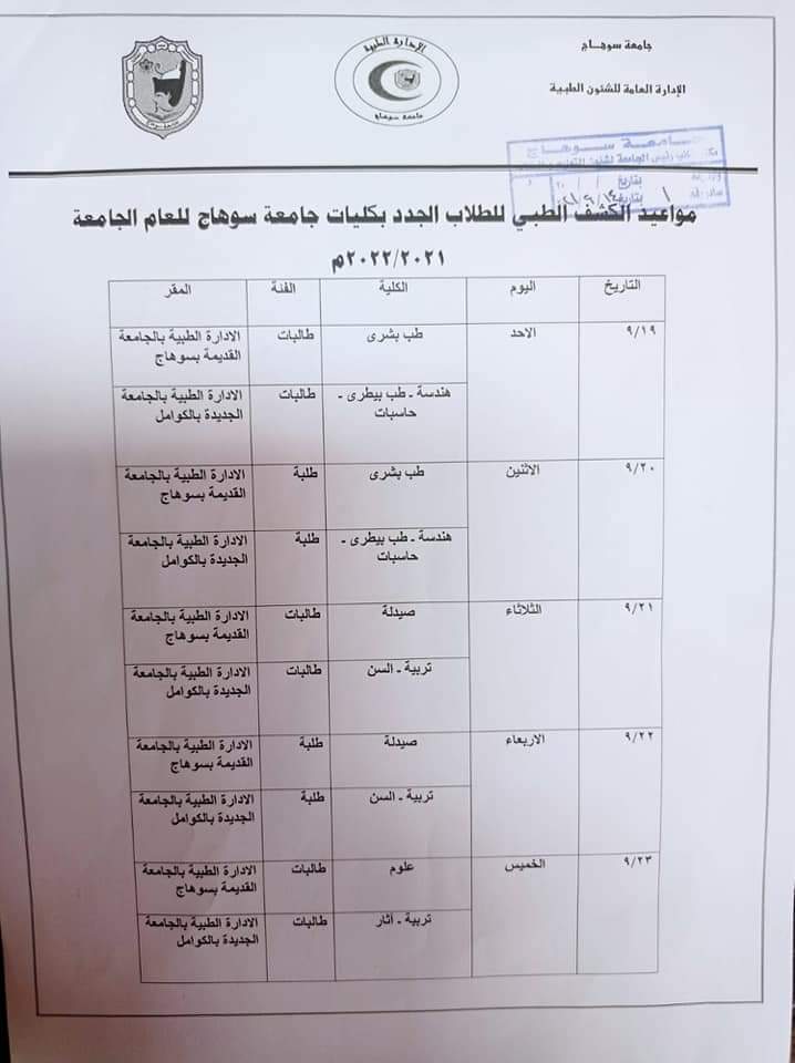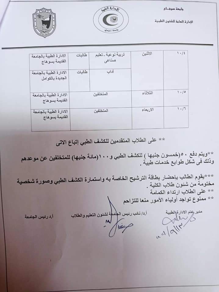 وبالنسبة "لطلاب" كليتي التجارة والآثار تم تخصيص يوم الاحد الموافق 26 سبتمبر لتوقيع الكشف الطبي لهم بمقر الإدارة الطبية بالمقر الجديد، وطلاب كلية العلوم بالإدارة الطبية بالمقر القديم للجامعة.