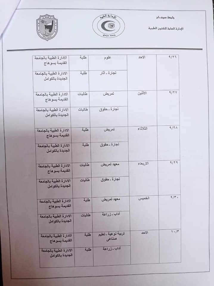 كما تم تحديد يوم الإثنين 27 سبتمبر لطالبات كليتي التجارة والحقوق بالإدارة الطبية بالمقر الجديد، وطالبات كلية التمريض بالمقر القديم، ويليه يوم الثلاثاء الموافق 28 سبتمبر للطلبة بنفس الأماكن، كما تم تخصيص يوم الأربعاء الموافق 29 سبتمبر لطالبات كليتي التجارة والحقوق بالإدارة الطبية بالمقر الجديد وطالبات معهد التمريض بالمقر القديم، أما يوم الخميس الموافق 30 سبتمبر، فتم تخصيصه لطلاب معهد التمريض لتلقي الكشف الطبي بالإدارة الطبية بالمقر القديم، وطالبات كليتي الآداب والزراعة بمقر الإدارة الطبية بالجامعة الجديدة.