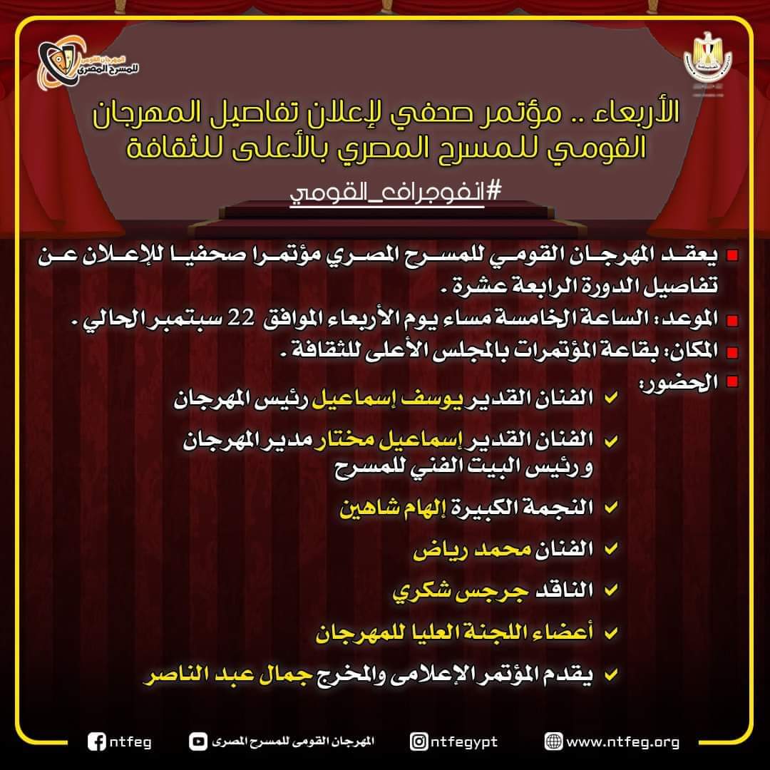 يعقد المهرجان القومي للمسرح المصري، مؤتمرًا صحفيًا غدًا الأربعاء الساعة الخامسة مساء بقاعة المؤتمرات بالمجلس الأعلى للثقافة، للإعلان عن تفاصيل الدورة الرابعة عشرة.