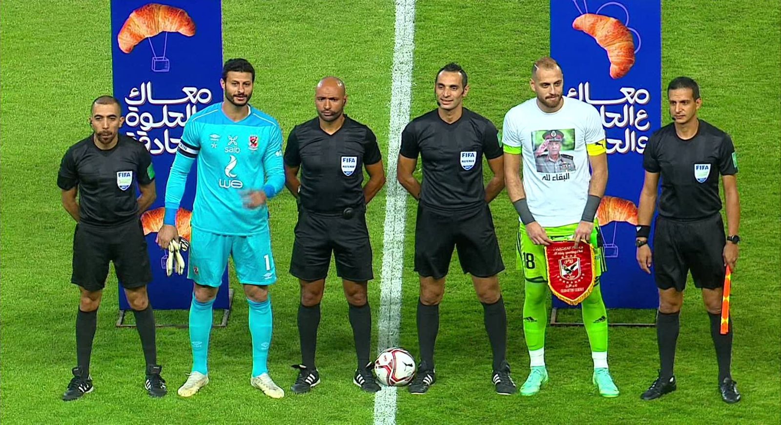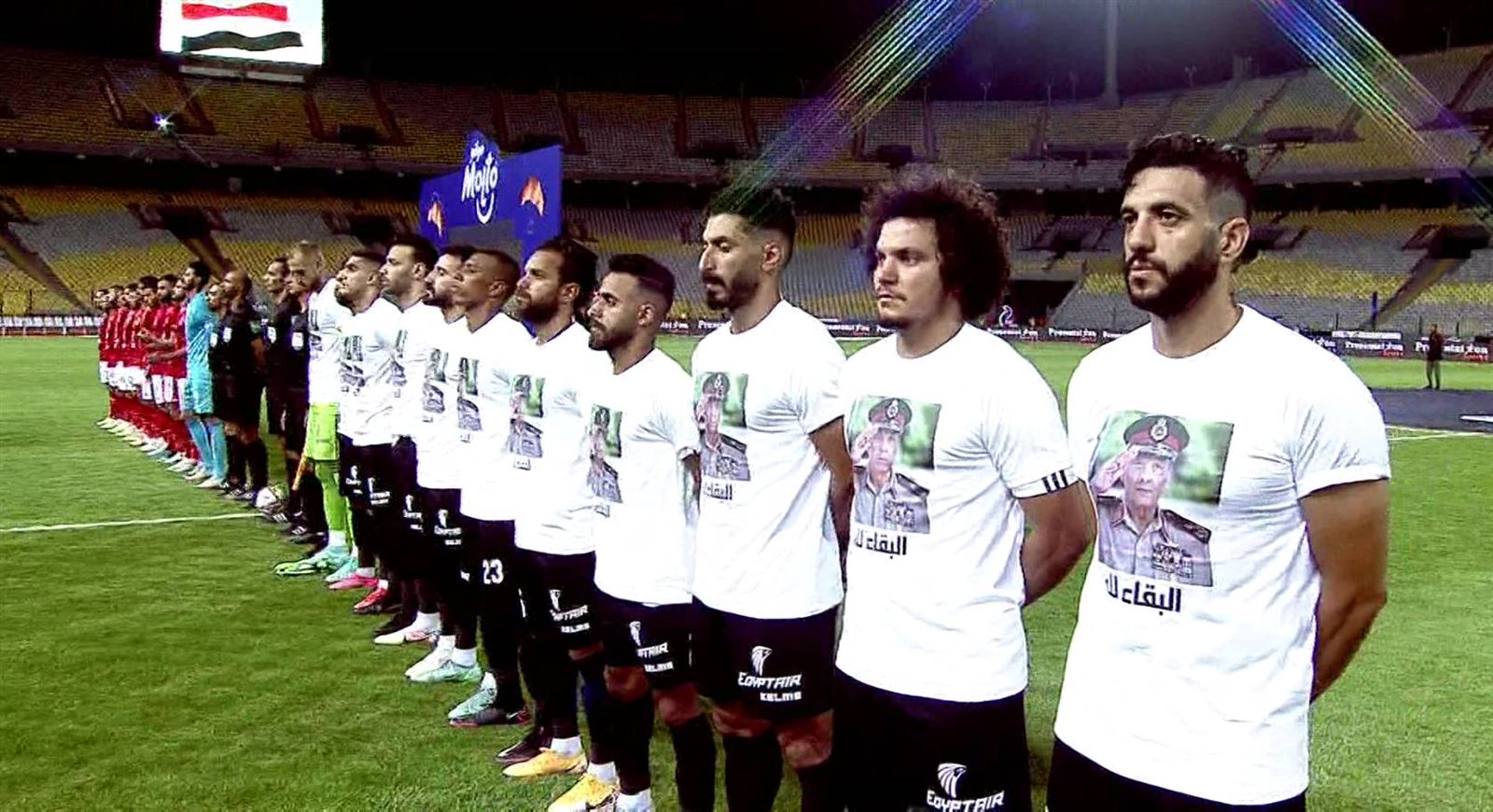 لاعبو طلائع الجيش بقميص يحمل صورة المشير طنطاوي قبل مواجهة الأهلي في السوبر