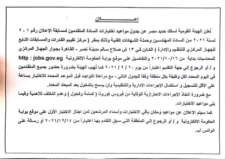 أعلنت الهيئة القومية لسكك حديد مصر جدول مواعيد اختبارات السادة المتقدمين لمسابقة الإعلان رقم 1،2 لسنة 2021 من السادة المهندسين وحملة الشهادات الفنية وذلك بمقر مركز تقييم القدرات والمسابقات التابع للجهاز المركزي للتنظيم والإدارة الكائن في 13 ش صلاح سالم مدينة نصر - القاهرة بجوار الجهاز المركزي للمحاسبات بداية من 11/10/2021.