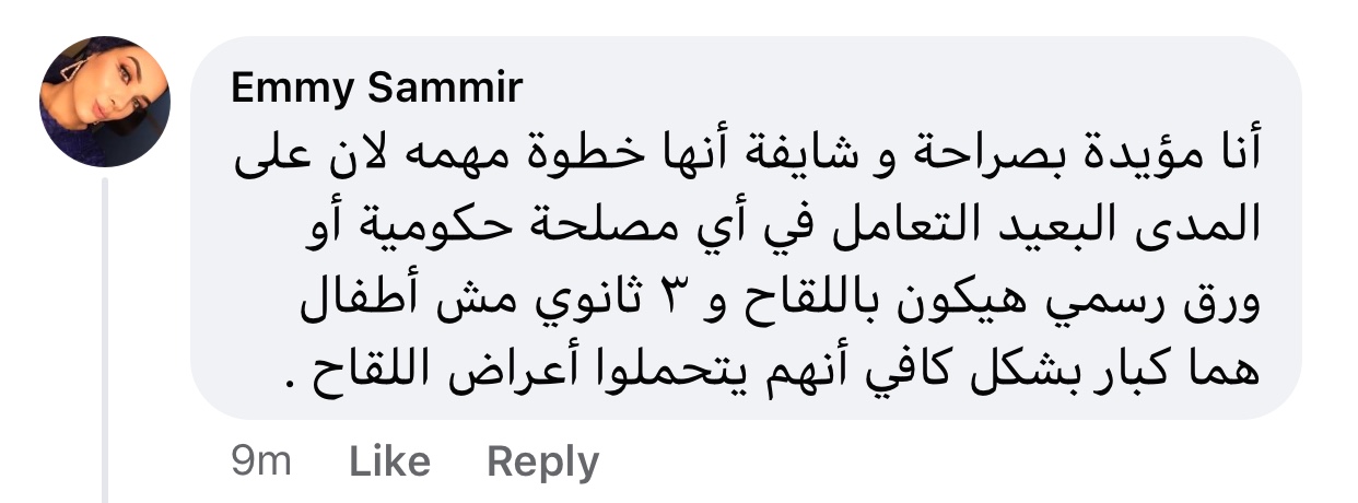 من جانبها، كتبت إيمي سمير، على موقع التواصل الاجتماعي، فيس بوك، أنها تؤيد هذا القرار وترى أنها خطوة مهمة، وأنه سيصبح بمثابة ورق رسمي لا يتم التعامل إلا من خلاله، وأضافت: 3 ثانوي مش أطفال هما كبار بشكل كافٍ أنهم يتحملوا أعراض اللقاح.