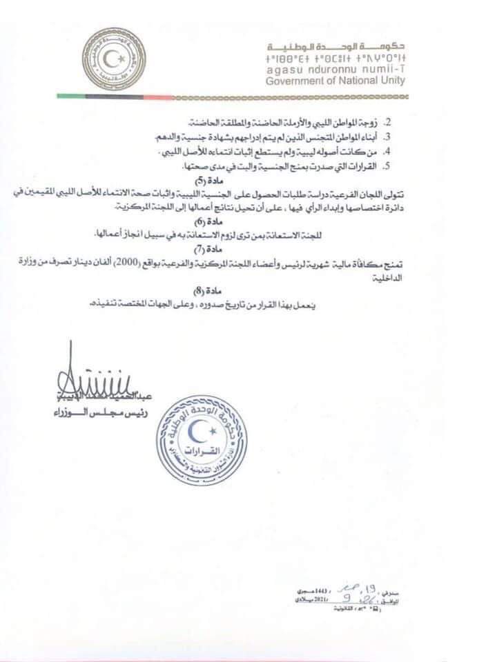قرر عبد الحميد الدبيبة، رئيس حكومة الوحدة الوطنية الليبية، تشكيل لجنة مركزية لدراسة طلبات الحصول على الجنسية الليبية، واثبات صحة الانتماء للأصل