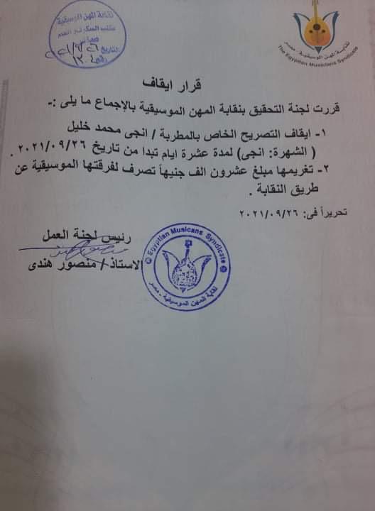 وأصدرت نقابة المهن الموسيقية بيانا قررت فيه إيقاف المطربة إنجي محمد خليل لمدة 10 أيام تبدأ من تاريخ 26 من الشهر الجاري وتغريمها 20 ألف جنيه لمخالفاتها تعليمات النقابة وتصرف لفرقتها الموسيقية.
