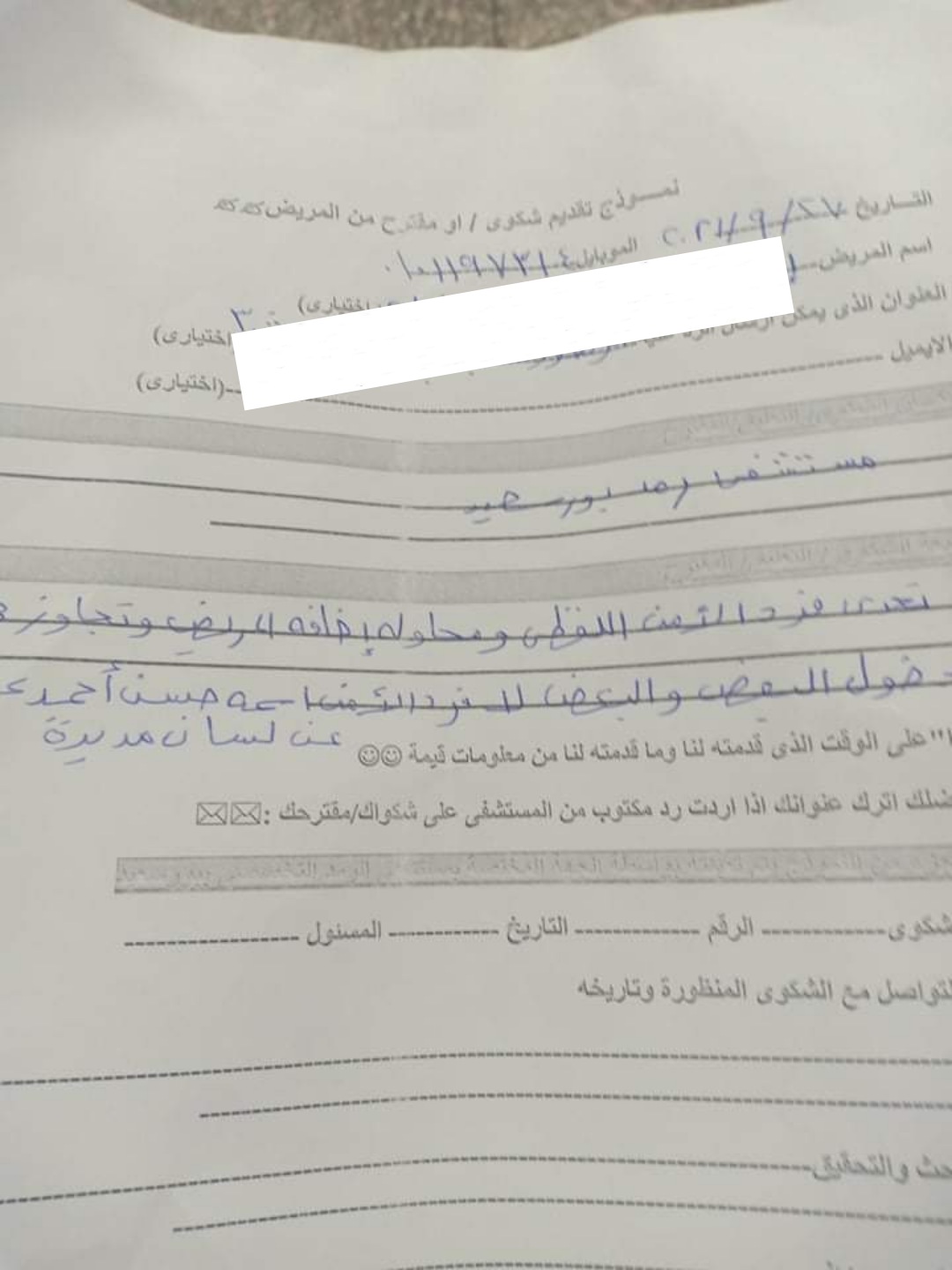 لفتت السيدة، إلى أنها تقدمت بالشكوى ضد فرد الأمن، كما أبلغها به المدير المسئول عنه، وحصلت على صور ضوئية منها، ووثقت وضع الشكوى بصندوق الشكاوى، كما أبلغها المسئولون في مستشفى الرمد، مؤكدة أنها ستتابع شكواها والقرار والإجراء المناسب فيها، أو تقدمها إلى جهات أعلى بحثًا عن حقها، وحق آلاف المرضى المترددين على المستشفى.