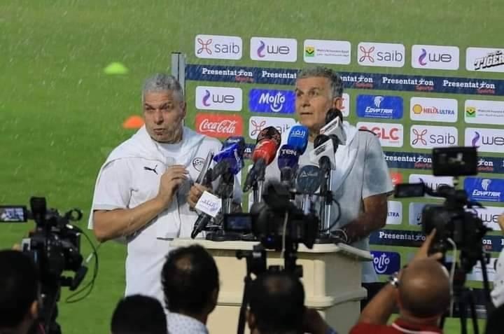 تعرض البرتغالي كارلوس كيروش، المدير الفني لمنتخب مصر، ووائل جمعة، مدير المنتخب، لموقف طريف، في أثناء المؤتمر الصحفي الذي عقده الجهاز الفني للفراعنة، قبل انطلاق المران الأول.