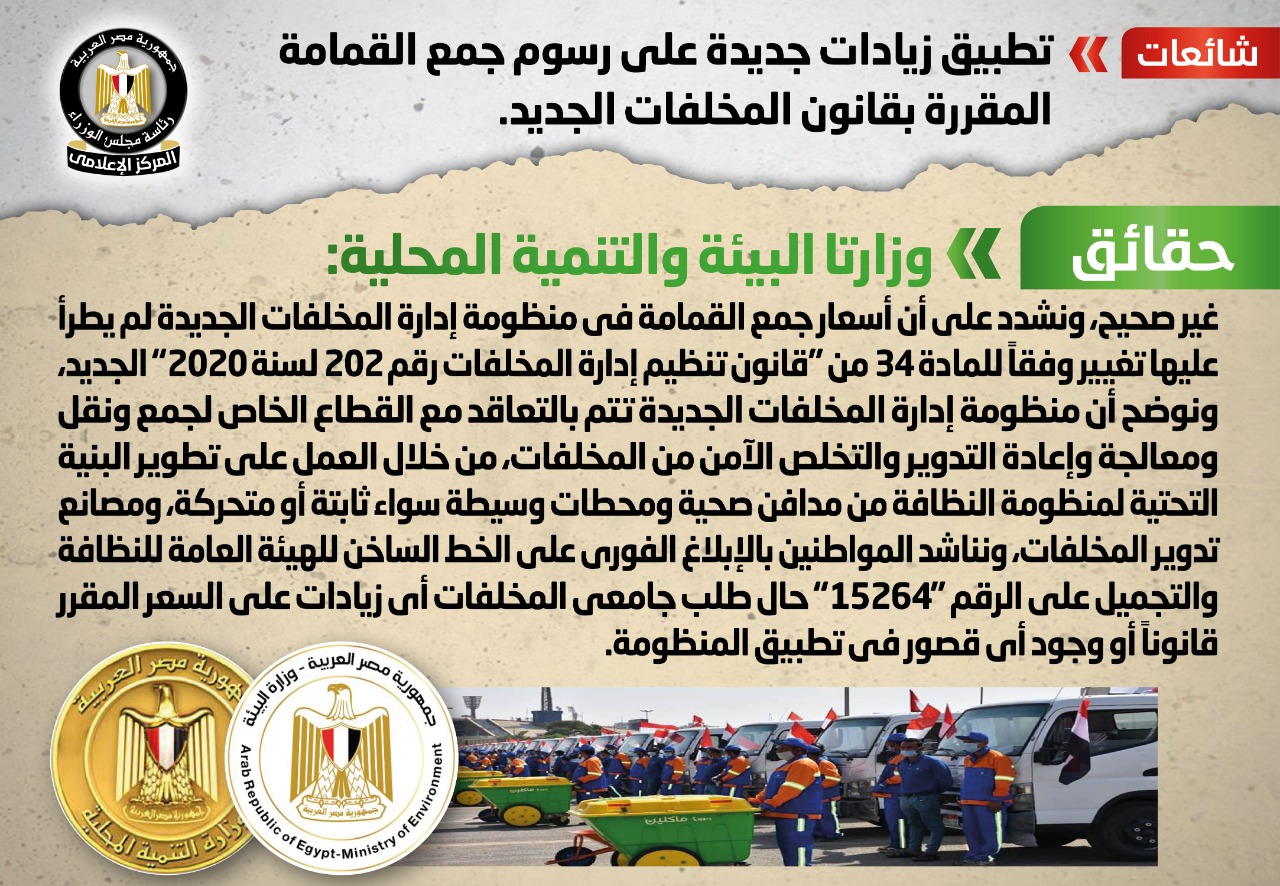 وفي هذا السياق، تواصل المركز الإعلامي لمجلس الوزراء، مع وزارتي البيئة والتنمية المحلية، وقد تم نفي تلك الأنباء، وأكدت الوزارتان أنه لا صحة لتطبيق أي زيادات جديدة على رسوم جمع القمامة المقررة بقانون المخلفات الجديد، وشددتا على أن أسعار جمع القمامة في منظومة إدارة المخلفات الجديدة لم يطرأ عليها تغيير وفقًا للمادة 34 من قانون تنظيم إدارة المخلفات رقم 202 لسنة 2020 الجديد.