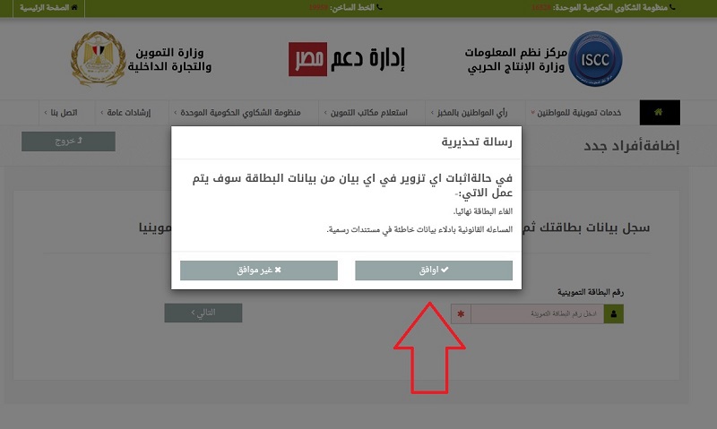 - ثم تظهر لك شاشة بها إقرار ينص على أنه في حال إثبات أي تزوير في أي بيان من بيانات البطاقة سوق يتم إلغاء البطاقة التموينية نهائيًا، كذلك سيتعرض المزور للمساءلة القانونية بإدلاء بيانات خاطئة في مستندات رسمية، واضغط على "أوافق".