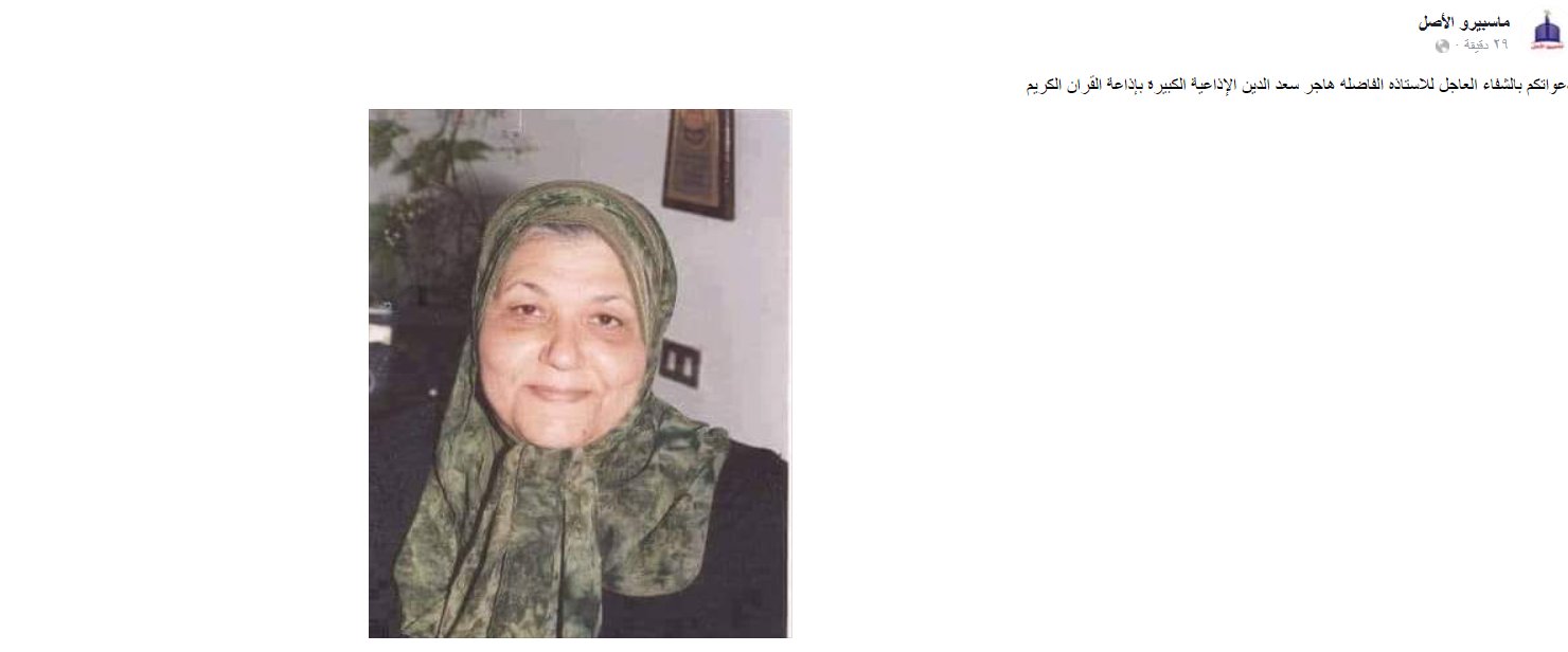 ونشرت الصفحة الرسمية لاتحاد الإذاعة والتليفزيون ماسبيرو، صورة الإذاعية هاجر سعد الدين، وذلك عبر موقع التواصل الاجتماعي فيس بوك، وعلقت عليها قائلة: دعواتكم بالشفاء العاجل للأستاذة الفاضلة هاجر سعد الدين.. الإذاعية الكبيرة بإذاعة القرآن الكريم.