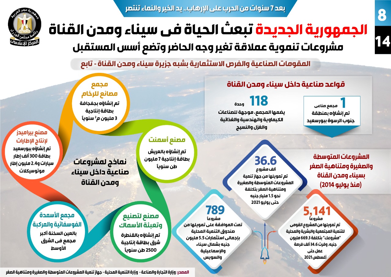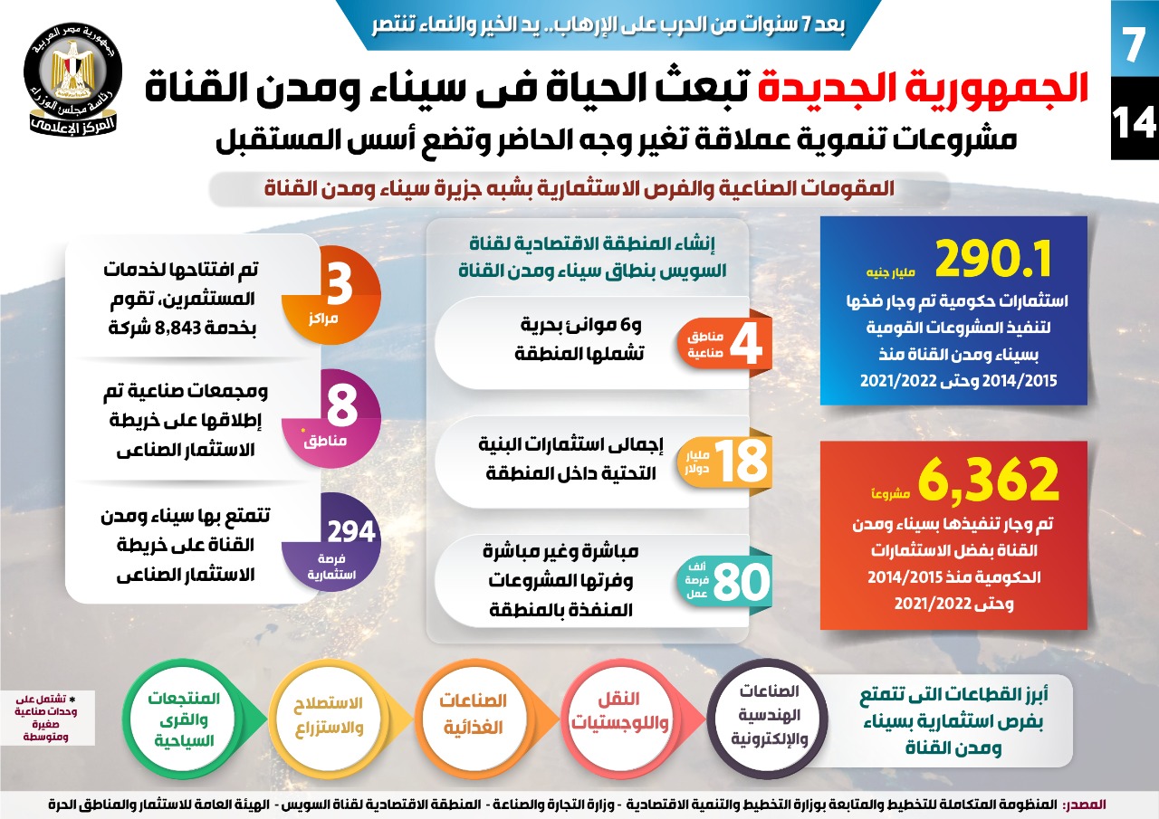 نشر المركز الإعلامي لمجلس الوزراء، تقريرًا تضمن إنفوجرافات، تسلط الضوء على جهود الجمهورية الجديدة من أجل تنمية سيناء ومدن القناة، من خلال التوسع في تنفيذ المشروعات القومية والتنموية، التي تغير وجه الحاضر وتضع أسس المستقبل، لتنتصر يد الخير والنماء بعد 7 سنوات من الحرب على الإرهاب.