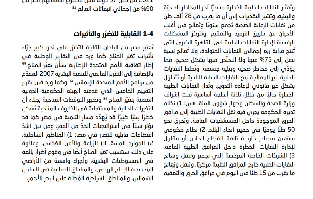 وأضاف التقرير الذي حصل القاهرة 24 على نسخة منه، أن النفايات الطبية الخطرة تعد مصدرًا آخر للمخاطر الصحية والبيئية التي تتعرض لها مصر وأن هناك ما يقرب من 28 ألف طن من نفايات الرعاية الصحية، تُجمع سنويًا، وتُعالج في أغلب الأحيان عن طريق الترميد والتعقيم.