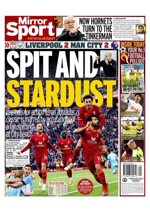 تصدر عنوان لحظة صلاح السحرية غلاف صحيفة ميرور الإنجليزية في العدد الصادر عن اليوم، وذلك في إشارة منها أن هدف صلاح جعل هناك تألق عظيم من الجانبين في مباراة السيتي وليفربول.