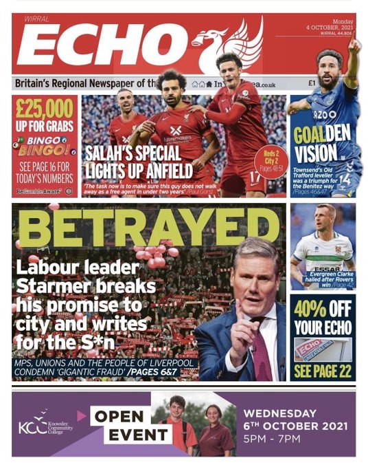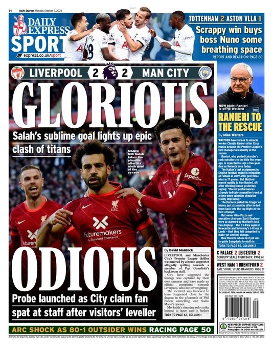 تصدر عنوان سحر صلاح غير كاف في آنفيلد بعد أن سرق السيتي التعادل، في إشادة بالهدف الأبرز في المسابقة حتى الآن، وكذلك مع دعم الصحيفة المُختصة بأخبار مانشستر سيتي لفريقها دون إنكار تألق صلاح.