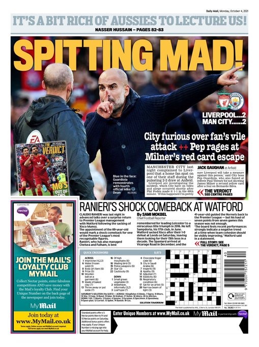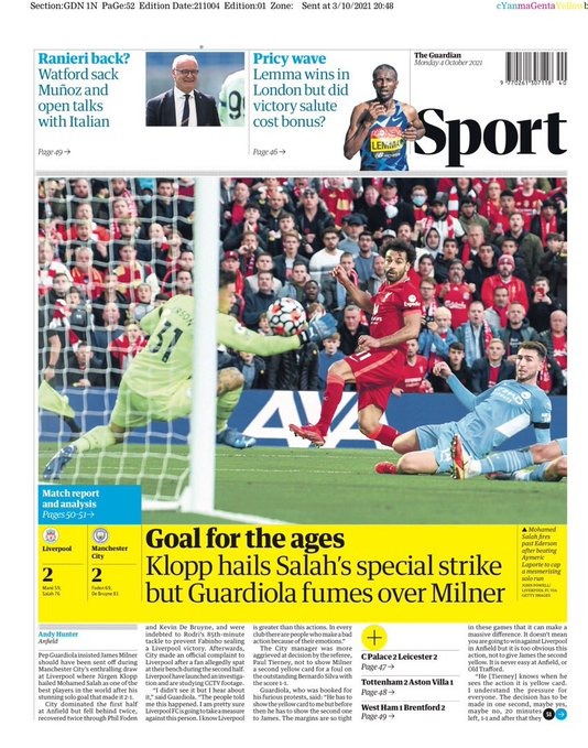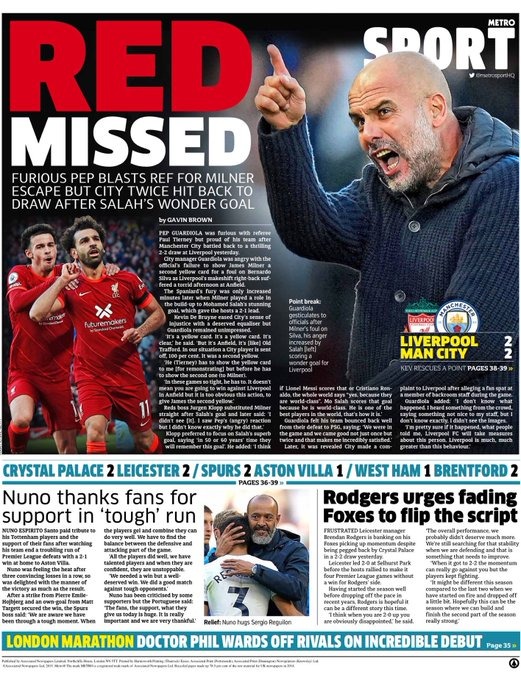 سلطت الصحيفة الضوء في غلافها على تألق محمد صلاح في إطار غضب المدرب بيب جوارديولا، حيث عنونت بـ هدف مذهل من صلاح.. بيب يشن هجومًا على الحكم لعدم طرد ميلنر.