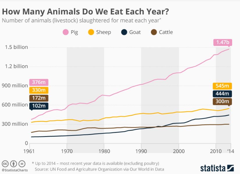 يوضح الرسم البياني التالي كيف ارتفع عدد حيوانات الماشية المذبوحة، من خلال موقع statista منذ الستينيات.
