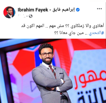 أعلن الإعلامي الرياضي إبراهيم فايق، انضمامه لهذا التحدي، ولم يكشف عن تفاصيله هو أيضًا، فقط اكتفى بالتعليق عبر حسابه على فيس بوك كاتبا: أهلاوي ولا زملكاوي؟ مش مهم.. المهم أكون قد التحدي.. مين جاي معانا؟.