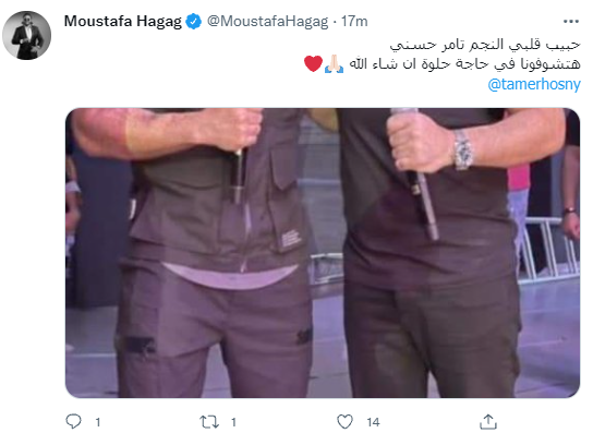 ونشر مصطفى حجاج صورة تجمعه بتامر حسني، عبر حسابه الخاص على موقع تويتر، معلنًا عن تعاونهما في عمل جديد قائلًا: حبيب قلبي النجم تامر حسني…هتشوفونا في حاجة حلوة إن شاء الله.