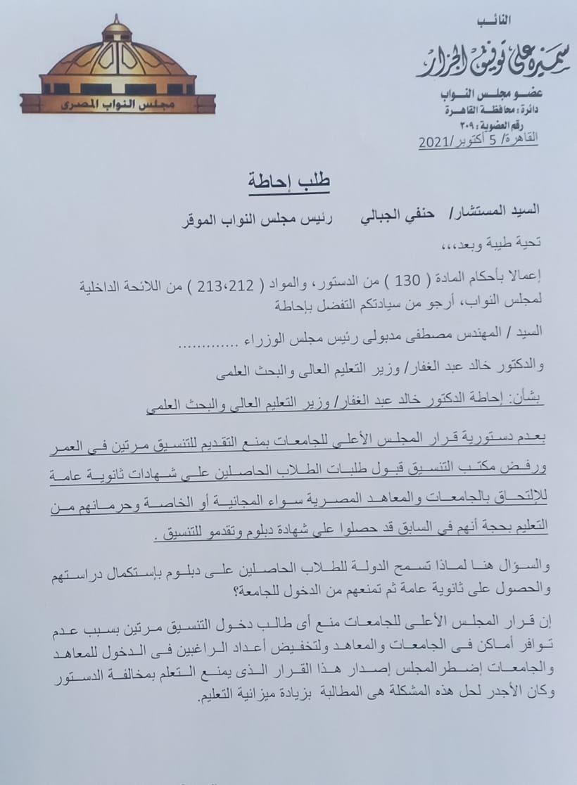 طلب إحاطة للحكومة بشأن عدم دستورية قرار الأعلى الجامعات بمنع التقديم للتنسيق مرتين