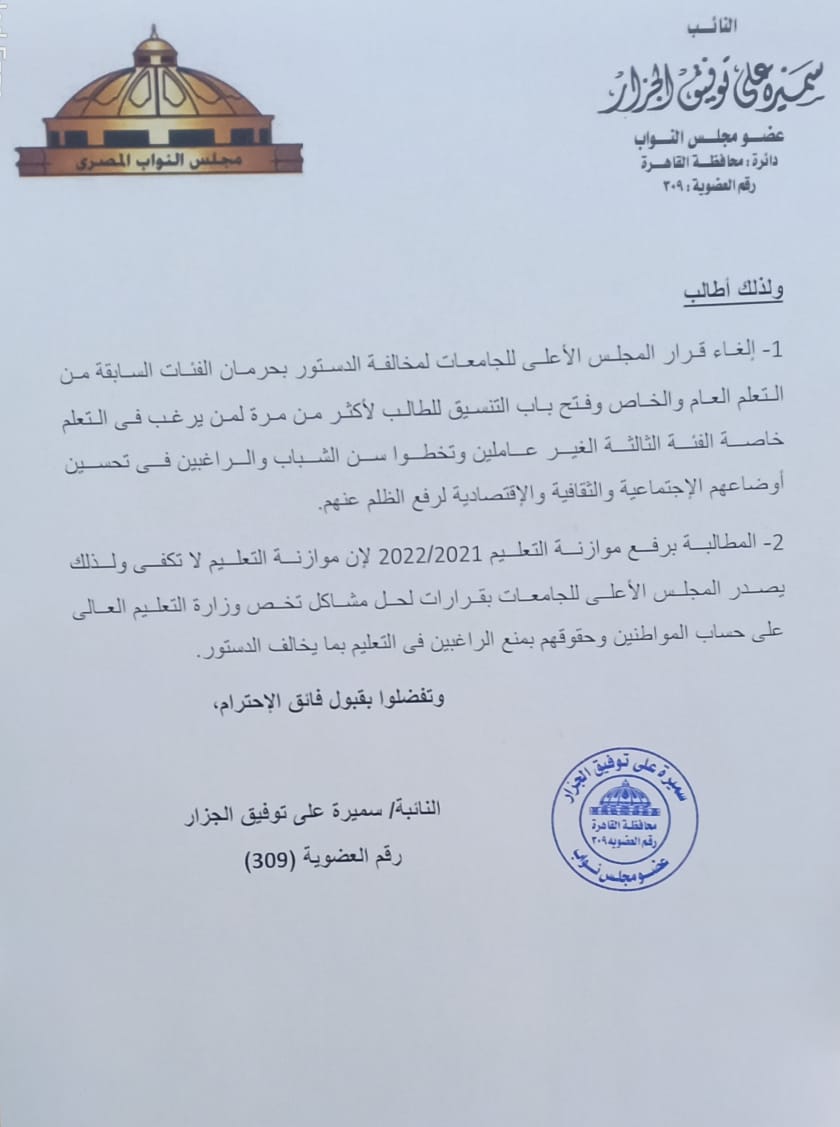 وبناء على ما سبق، طالبت النائبة بإلغاء قرار المجلس الأعلى للجامعات المشار إليه، وذلك لمخالفته الدستور بحرمان الفئات السابقة من التعلم العام والخاص، وفتح باب التنسيق للطالب لأكثر من مرة لمن يرغب في التعلم، خاصة الفئة الثالثة من غير العاملين الذين تخطوا سن الشباب والراغبين في تحسين أوضاعهم الاجتماعية والثقافية والاقتصادية لرفع الظلم عنهم.