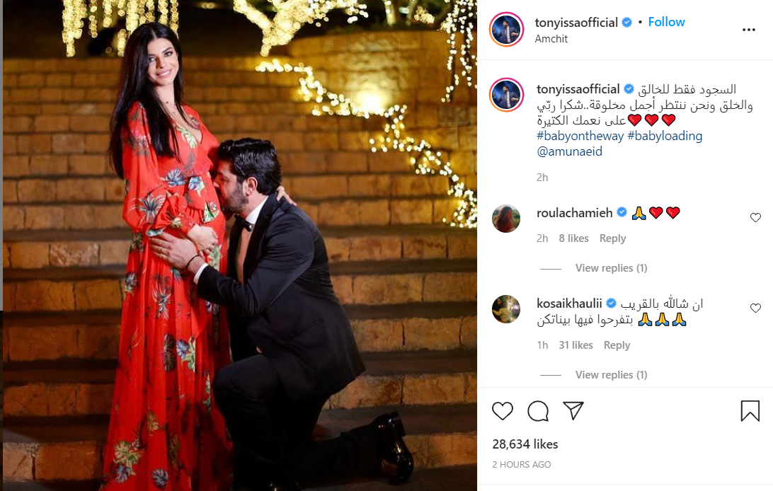 نشر طوني عيسى صورة برفقة زوجته أمونة، وهو راكع على الأرض ويقبل بطن زوجته، عبر حسابه الرسمي على موقع انستجرام، وكتب عليها قائلًا: السجود فقط للخالق، والخلق، ونحن ننتظر أجمل مخلوقة.. شكرًا ربي على نعمك الكثيرة.