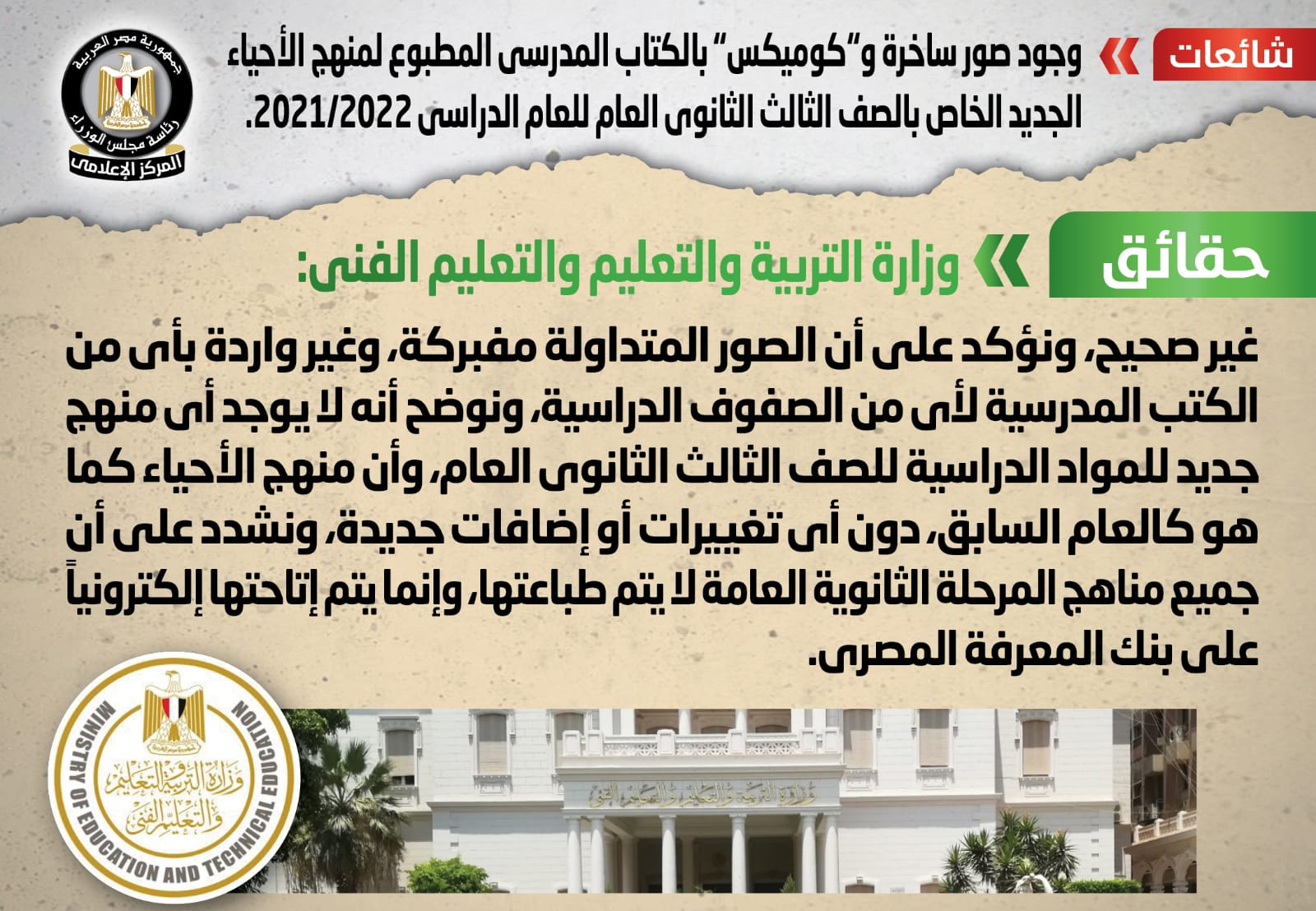 وتواصل المركز الإعلامي لمجلس الوزراء مع وزارة التربية والتعليم والتعليم الفني، والتي نفت تلك الأنباء، مُؤكدةً أنه لا صحة لوجود صور ساخرة وكوميكس بالكتاب المدرسي المطبوع لمنهج الأحياء الجديد الخاص بالصف الثالث الثانوي العام للعام الدراسي 2021/2022، وأن الصور المتداولة مفبركة، وغير واردة بأي من الكتب المدرسية لأي من الصفوف الدراسية.