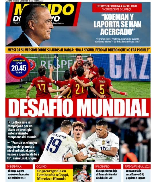 تصدر عنوان تحدي عالمي بنهائي كأس الأمم الأوروبية، غلاف صحيفة موندو ديبورتيفو الإسبانية، وذلك في رسالة تحفيزية لكتيبة لويس إنريكي قبل مواجهة الليلة ضد فرنسا.