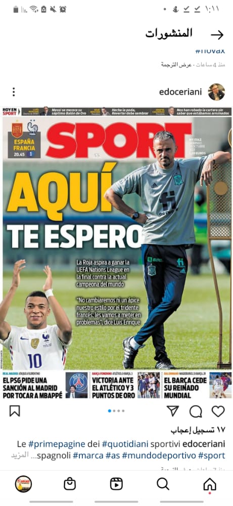 تصدر عنوان ننتظرك إنريكي، غلاف صحيفة سبورت الإسبانية، مع اقتراب لقاء الليلة بين فرنسا وإسبانيا في نهائي دوري الأمم الأوروبية.