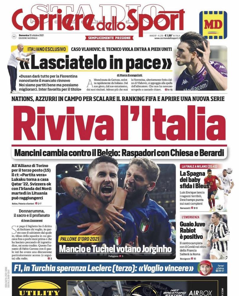 عنونت صحيفة توتو سبورت الإيطالية صفحتها الأولى بمعجزة مانشيني، وذلك في إشارة بأن الظروف تخدم إيطاليا للفوز بالمركز الثالث في دوري الأمم بعد إصابة لوكاكو أمس وقبله هازارد.