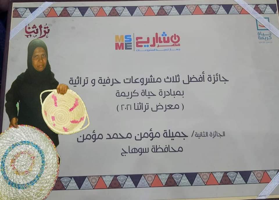 شاركت الحاجة جميلة مؤمن محمد مؤمن، صاحبة الـ48 عام، وتقيم بقرية بني هلال التابعة لمركز المراغة شمال محافظة سوهاج، بمعرض تراثنا للحرف اليدوية والتراثية تحت رعاية الرئيس السيسي رئيس الجمهورية.