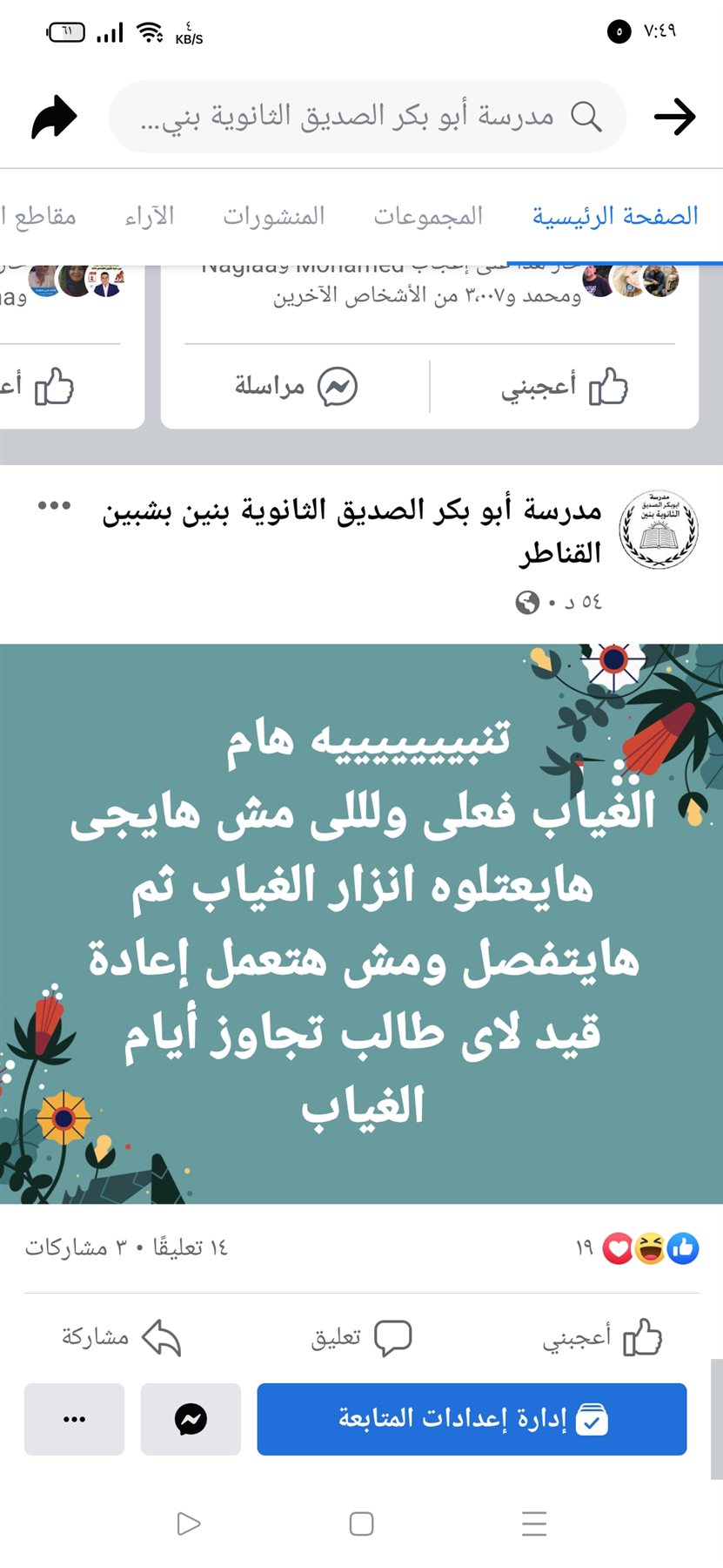 ناشدت إدارة مدرسة أبوبكر الصديق الثانوية بنين بشبين القناطر بمحافظة القليوبية، الطلاب عبر صفحتها الرسمية على موقع التواصل الاجتماعي فيسبوك، بعدم الغياب.