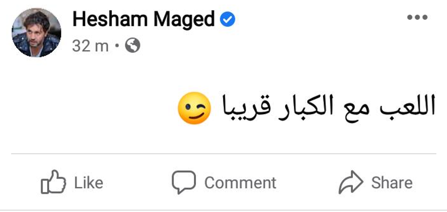 وكتب هشام ماجد منشورًا، عبر حسابه الخاص بموقع التواصل الاجتماعي فيسبوك، قائلًا: اللعب مع الكبار قريبًا.