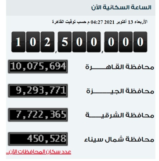 أعلنت الساعة السكانية الموجودة أعلى مبنى الجهاز المركزي للتعبئة العامة والإحصاء اليوم، وصول عدد سكان مصر بالداخل إلى 102 مليون و500 ألف نسمة بزيادة قدرها نصف مليون نسمة خلال 100 يوم، حيث سجل عدد سكان مصر 102 مليون نسمة في 5 يوليو من العام الجاري.