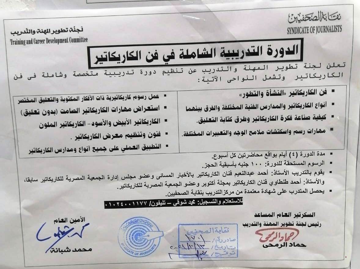 أعلنت لـجنة تطوير المهنة والتدريب بنقابة الصحفيين، عن عقد دورة تدريبية متخصصة وشاملة في فن الكاريكاتير.
