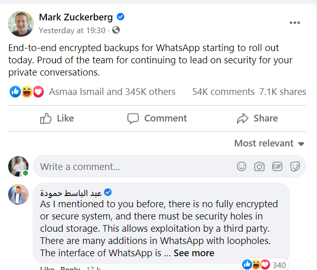 أثار المطرب الشعبي عبد الباسط حمودة منذ قليل الجدل على مواقع التواصل الاجتماعي، بتعليقه باللغة الإنجليزية على منشور لمارك زوكربيرج مؤسس موقع الفيس بوك، والذي شرح فيه النسخ الاحتياطية المشفرة لتطبيق واتس آب، خاصةً بعد الأزمة الأخيرة التي واجهت تطبيقات مواقع التواصل الاجتماعي.