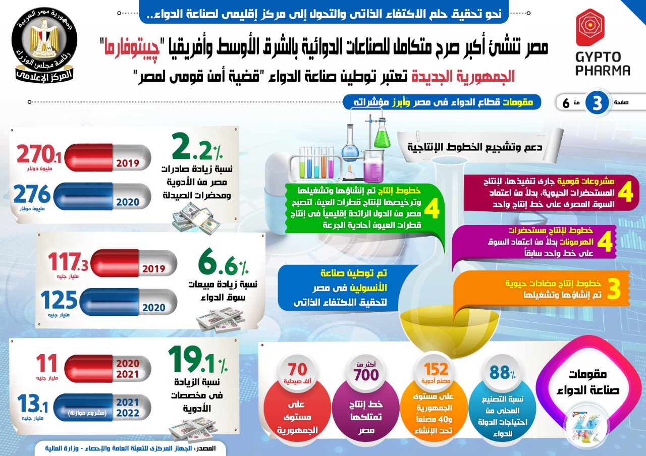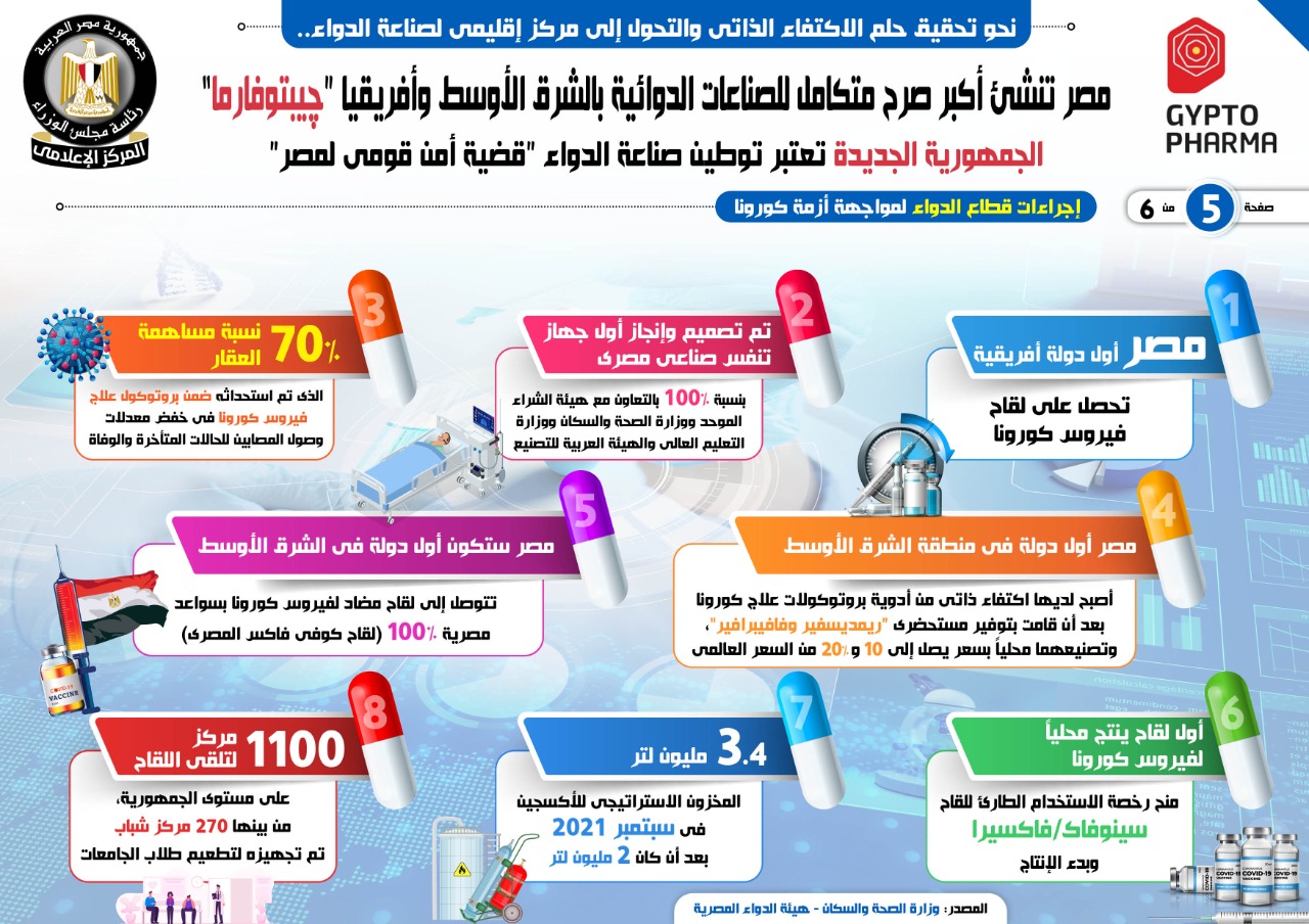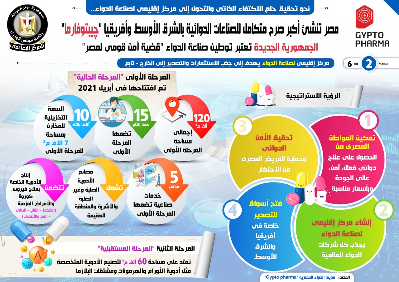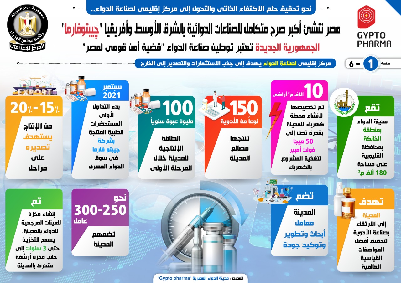 نشر المركز الإعلامي لمجلس الوزراء، تقريرًا، تضمن إنفوجرافات، تسلط الضوء على إنشاء أكبر صرح متكامل للصناعات الدوائية بالشرق الأوسط وإفريقيا چيبتوفارما؛ بما يدعم الوصول إلى الاكتفاء الذاتي من الدواء، باعتباره أمن قومي لمصر، فضلًا عن التحول إلى مركز إقليمي لصناعة الدواء.