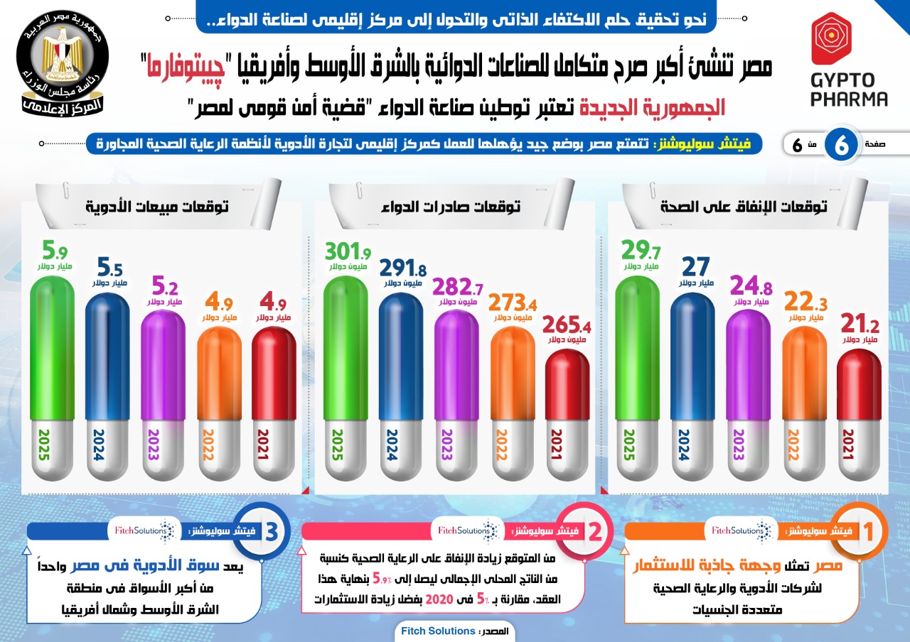 ووفقًا لفيتش سوليوشنز أيضًا، فإن سوق الأدوية في مصر يعد واحدًا من أكبر الأسواق في الشرق الأوسط وشمال إفريقيا، كما من المتوقع زيادة الإنفاق على الرعاية الصحية كنسبة من الناتج المحلي الإجمالي ليصل إلى 5.9% بنهاية هذا العقد مقارنة بـ 5% في 2020، وذلك بفضل زيادة الاستثمارات.