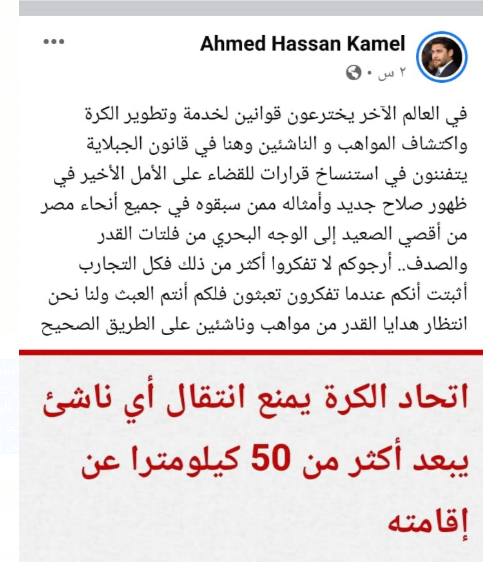 من جانبه، قال أحمد حسن، عبر حسابه على موقع التواصل الاجتماعي فيسبوك: في العالم الآخر يخترعون قوانين لخدمة وتطوير الكرة واكتشاف المواهب والناشئين، وهنا في قانون الجبلاية يتفننون في استنساخ قرارات للقضاء على الأمل الأخير في ظهور صلاح جديد وأمثاله ممن سبقوه في جميع أنحاء مصر من أقصي الصعيد إلى الوجه البحري من فلتات القدر والصدف.