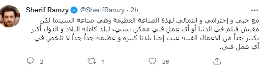 وكتب شريف رمزي تغريدة عبر حسابه الشخصي على تويتر، قائلًا: مع حبي واحترامي وانتمائي لهذه الصناعة العظيمة، وهي صناعة السينما لكن مفيش فيلم في الدنيا أو أي عمل فني ممكن يسيء لبلد كاملة.