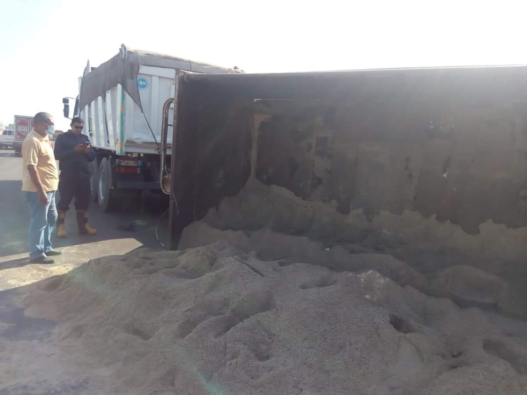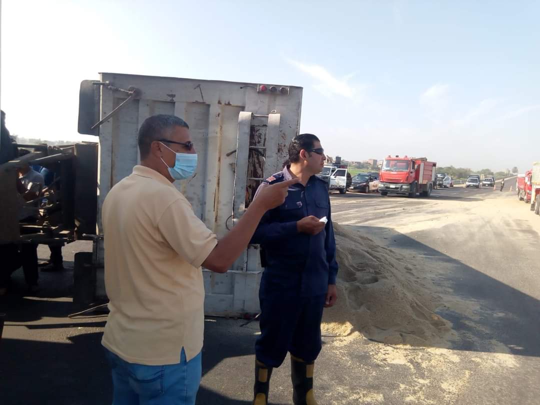 غلق جزئي للطريق الإقليمي بالمنوفية بعد انقلاب مقطورة محملة بالرمال | صور