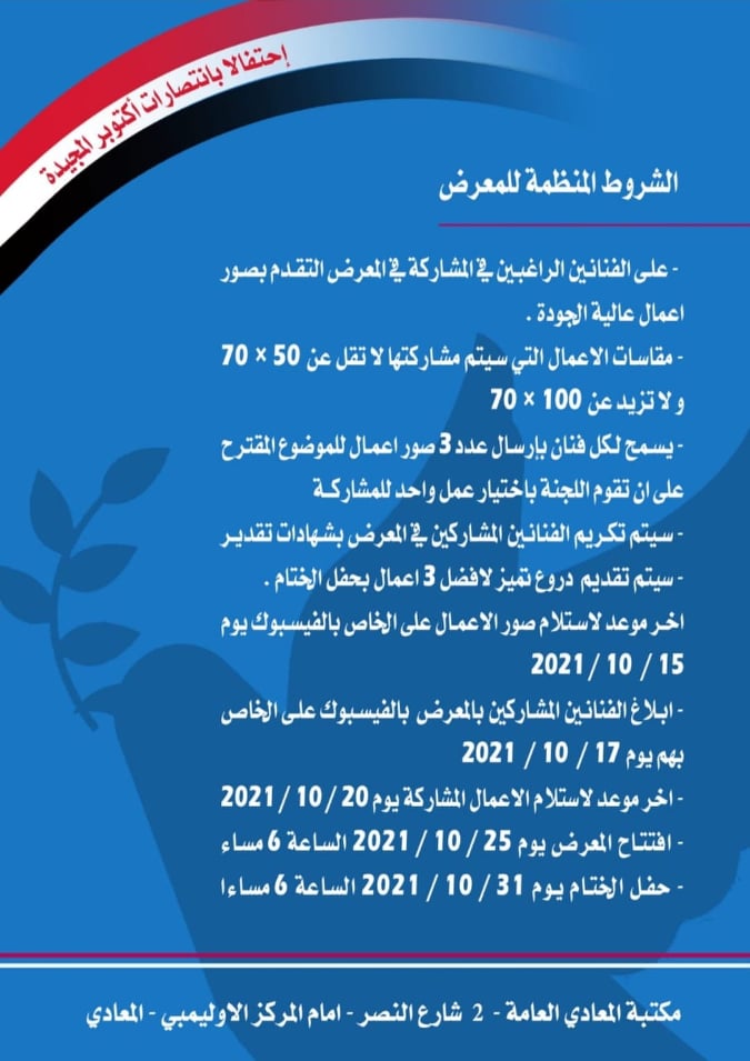 ويقيم المعرض بعدة شروط للراغبين في الاشتراك بالمعرض منها: التقدم بصور أعمال عالية الجودة، مقاسات الاعمال التي سيتم مشاركتها لا تقل عن 50×70 ولا تزيد عن 100×70، يسمح لكل فنان بإرسال 3 صور للموضوع المقترح على ان تقوم اللجنة باختيار عمل واحد للمشاركة، سيتم تكريم الفنانين المشاركين في المعرض بشهادات تقدير، ويتم تقديم دروع تميز لأفضل ثلاثة أعمال بحفل الختام، حيث أخر موعد لاستلام الاعمال الخاصة بالفيسبوك يوم الموافق 15 أكتوبر عام 2021، وأخر موعد استلام الأعمال المشاركة يوم 20 أكتوبر 2021.
