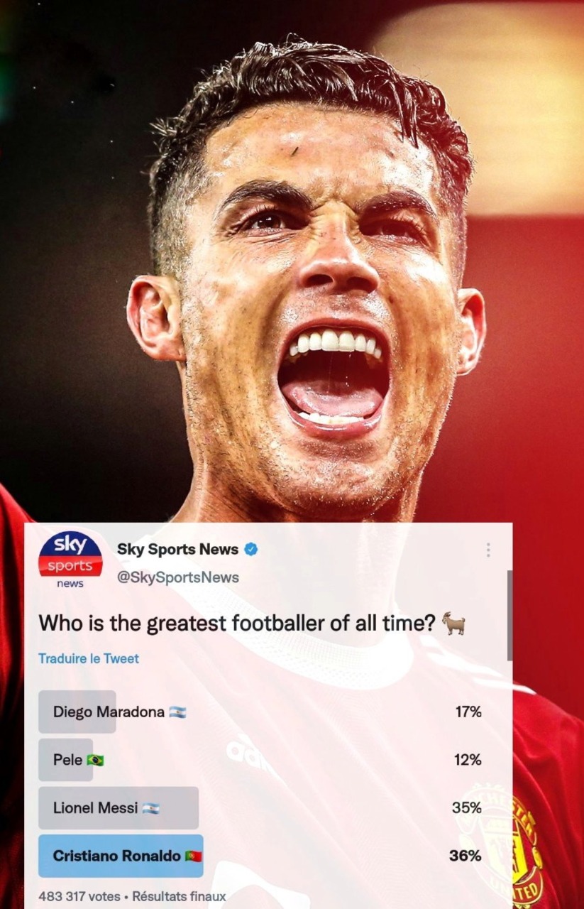 اختيار كريستيانو رونالدو كأفضل لاعب كرة قدم عبر التاريخ، جاء حسب نتائج التصويت في استطلاع أجرته قناة سكاي سبورت تضمن نحو 485000 صوت.