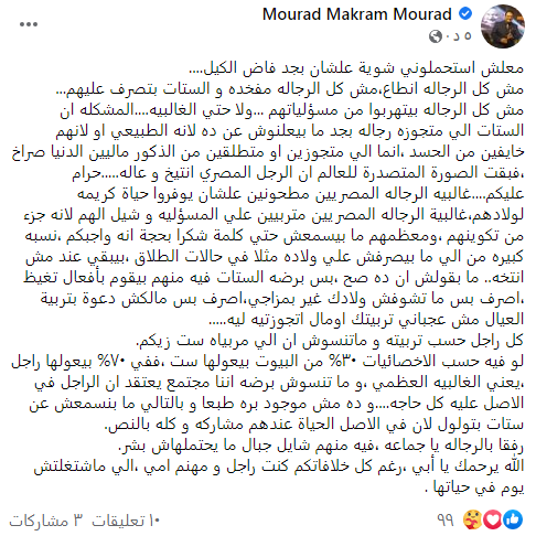 طالب الفنان مراد مكرم بإنصاف الرجل المصري في المجتمع، وذلك بعد حالة الهجوم الكبيرة التي يتعرض لها الرجال من قبل بعض السيدات، اللاتي يشكين من عدم تحمل الرجال المسؤولية، وانتشار فكرة أن السيدات هن اللاتي يَعُلْن بعض الأسر.